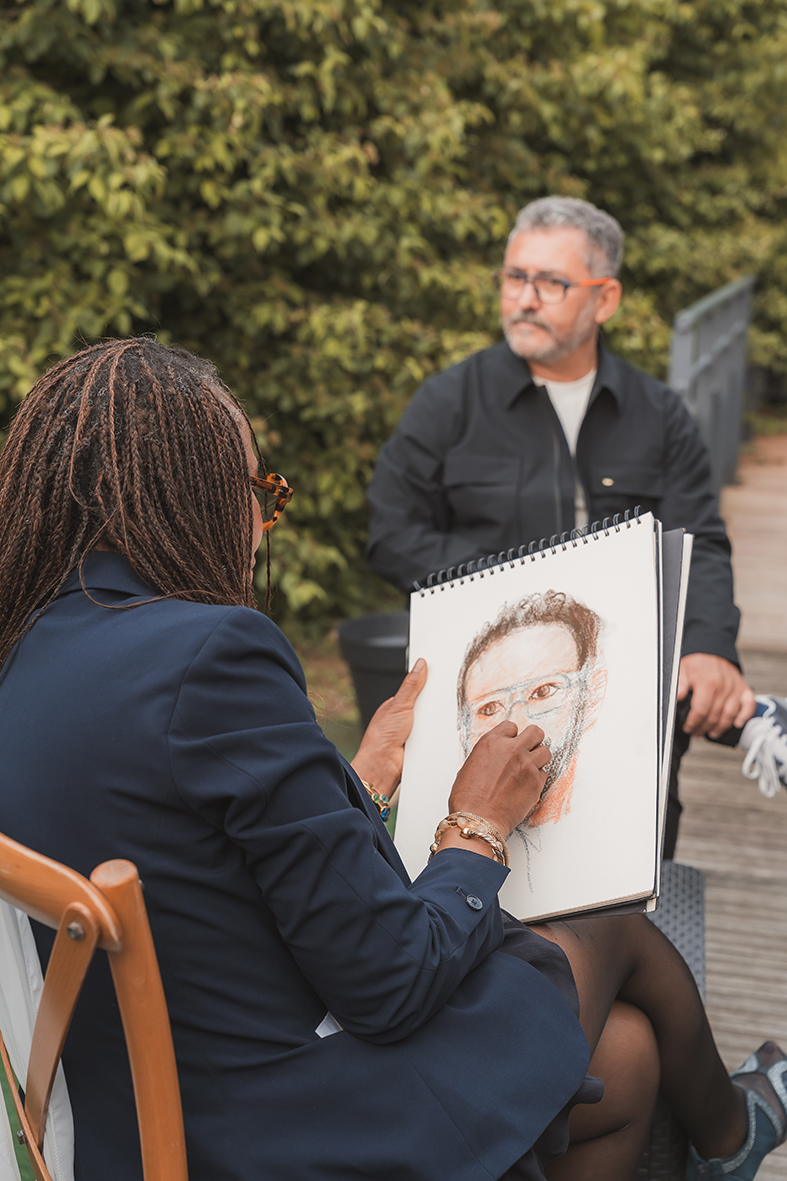 Un mariage, c’est une mosaïque d’instants : des regards échangés, des rires partagés, des gestes tendres, parfois furtifs, toujours sincères. Pour garder la trace de ces émotions naît l’idée d’un carnet de voyage du mariage — une collection de petites aquarelles, croquées sur le vif ou des grands formats aux pastels ou au crayon, qui racontent autrement la fête. Chaque touche de couleur saisit un moment : un invité qui sourit, un enfant qui danse, une main qui se tend. Ces moments poétiques deviennent des souvenirs à offrir, des fragments de vie à transmettre. Offrir une œuvre d’art à ses invités, c’est leur remettre un éclat de ce jour unique, une part d’émotion à garder précieusement. Les croquis du mariage, comme un carnet de voyage, gardent la mémoire du bonheur et des visages aimés — un souvenir artistique, personnel et vivant.